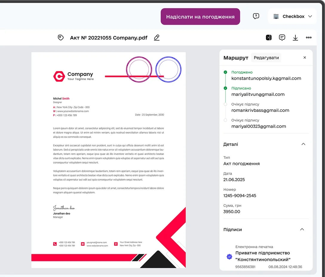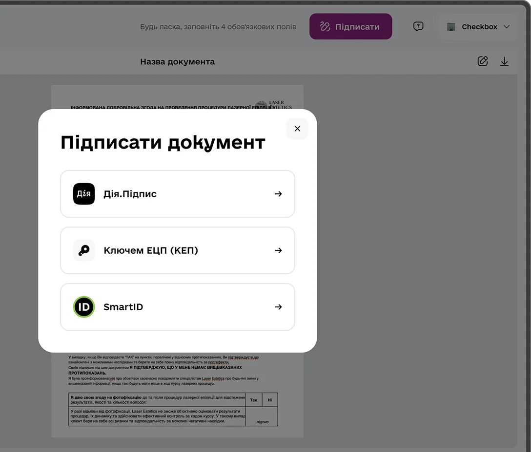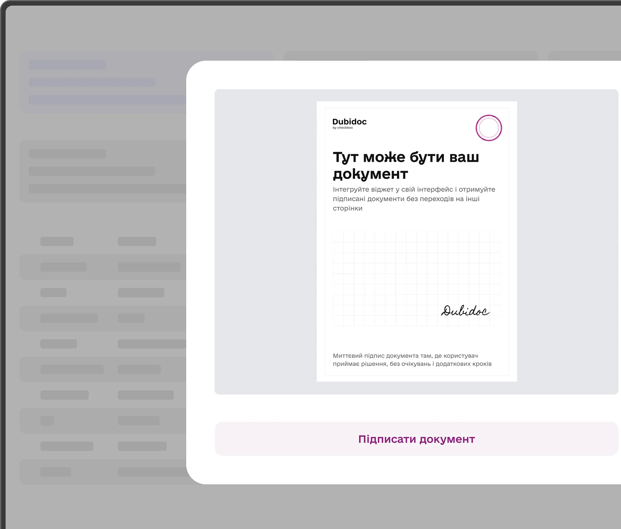Інтегруйте електронний підпис у ваш сайт або CRM без редиректів і зайвих дій. Надішліть документ на підпис, отримайтем результат – усе в вашому інтерфейсі